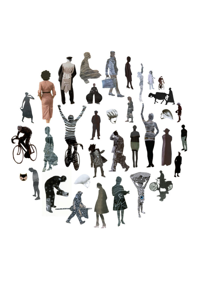De menselijke figuur en vooral de kop is mijn hoofdmotief. Al werk ik ook met dieren (mensen zijn ook dieren), auto’s en woorden. Door individuele trekken te vervagen en te vervangen vorm ik hybride types. Mijn figuren behelzen allerlei vlietende identiteiten. Vreemd en vertrouwd tegelijk. Soms herken je iemand of denk je dat maar.